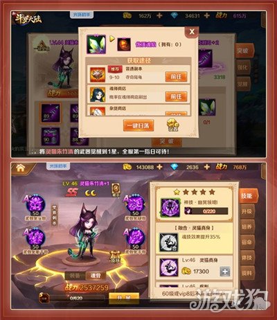 所有体力刷完正常的情况下,主力5人可以全部突破到蓝色+3,等级30级。灵猫装备强化到50级,其他4人装备强化到30级(节省金币提升人物技能等级)