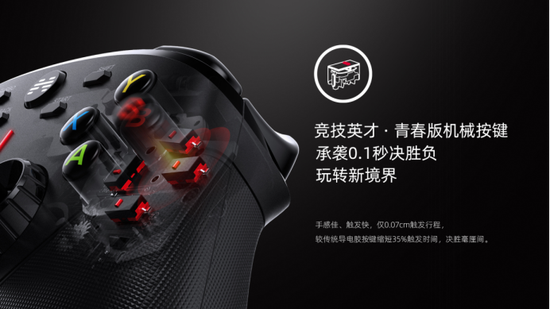 北通阿修罗3配备了北通宙斯精英手柄同款机械按键,按键触发行程仅0.7mm,触发速度比传统导电胶按键提升将近35%。清脆独特的手感反馈在游戏中更加过瘾,无论是连击还是单击每次按下都会带来畅爽的电竞体验!轻松秀出神操作!