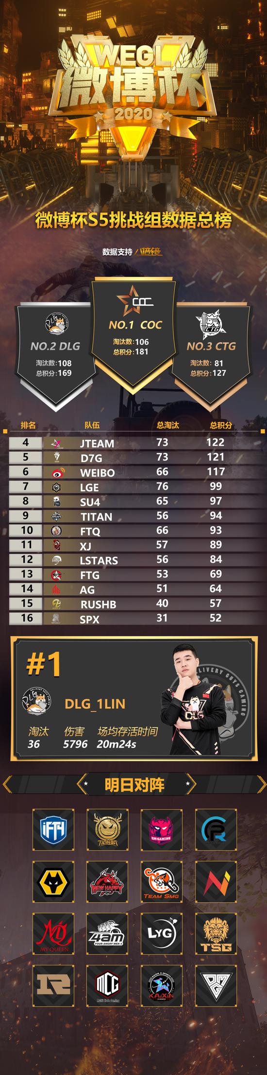 在六天的晋级赛中,各支战队的表现可谓是颇具亮点。前三天的挑战组晋级赛,卫冕冠军COC战队从一开始就展现了非常出色的状态,无论是淘汰分还是排名分都位居前列,最终他们也是以181分的超高分排在挑战组的首位。DLG战队则是18场比赛拿下最高的108个淘汰分,火力十足。微博战队在最后一场比赛中绝地求生吃下一鸡,从而压线获得了总决赛的晋级名额。