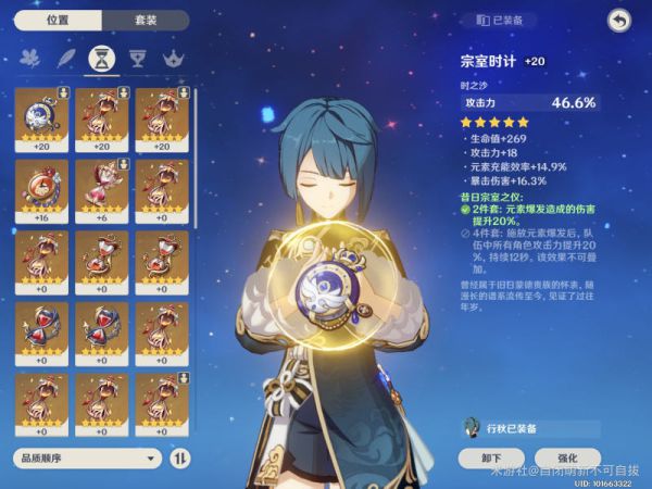 圣遗物的搭配并不绝对,可以宗室二件,可以赌徒2件,可以宗室四件,也可以配两件乐团。因为这些圣遗物的效果都是实打实的补充在行秋的输出上。行秋的最高输出还是要靠元素反应和爆伤才能打出来,所以通过乐团补充下精通也是极好的,但都不绝对,往好的词条挑套装也不差。