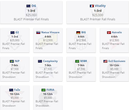 至此,BLAST Premier秋季赛三个小组结束,每个小组前二获得了晋级秋季总决赛的资格,他们分别是:OG、Vitality、G2、NaVi、BIG以及Astralis,剩余队伍则是要在本月晚些时候的showdown中争夺晋级秋季决赛的资格。