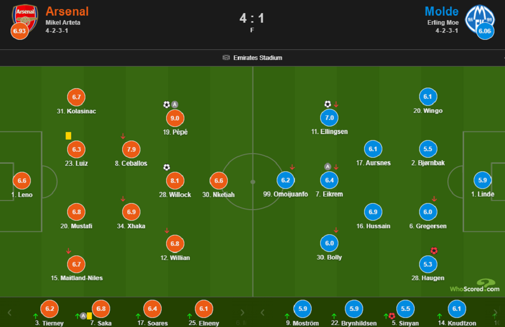 最终全场比赛结束,阿森纳主场4-1战胜莫尔德。