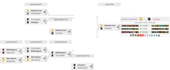 淘汰赛阶段MG.Trust也是一路畅通无阻先轻松战胜Adroit,接着淘汰赛两轮一共打了个5-1双杀Among Us这支由Abed、March等人临时组队的东南亚银河战舰成功夺得冠军。东南亚赛区的王者不再是菲律宾或是马来西亚,这次泰国人笑到了最后。