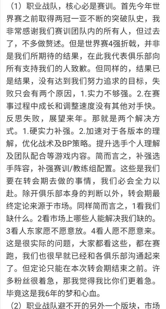 首先就是向LPL赛区粉丝进行了道歉,毕竟战队成绩不佳,经理也是有一定责任的,并且还表示在转会期进行一定的补强,无论是教练还是队员,都会在本次转会期结束之前尽力去争取,而且在下赛季还会加强战队的训练。
