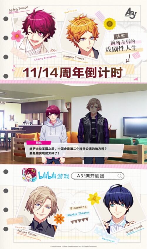 11月14日——《A3!满开剧团》一周年倒计时!新的一年,这个充满惊喜的剧团还将为总监督们带来哪些精彩新奇的剧目?随着春夏秋冬组4位新人的加入,未来的满开剧团又会有怎样的故事展开呢?
