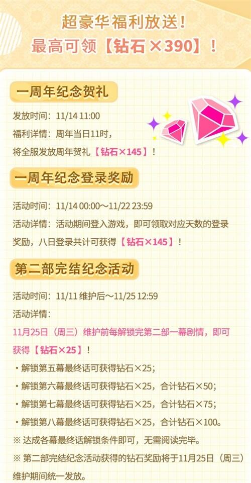 除此之外,还有海量周年福利放送!最高可领390钻!各位总监督快掏出小本本,记下《A3!满开剧团》一周年福利全情报吧~