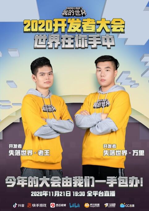 世界在你手中!冒险家们期待已久的开2020发者大会将于11月21日19点30分正式开启。欢迎冒险家们来到《我的世界》官方网站准时收看。与此同时,CC直播、抖音、快手、西瓜视频、BiliBili、虎牙、斗鱼、爱奇艺、优酷游戏、网易新闻直播、百度APP等各大平台将同步开启直播,一同见证这一年一度的盛会。这一次我们将打破次元,邀你一同走进虚拟的“方块世界”,以崭新的视听方式发布游戏未来版本、全新品牌计划、开发者工具更新等系列重磅内容!