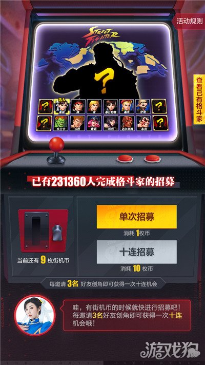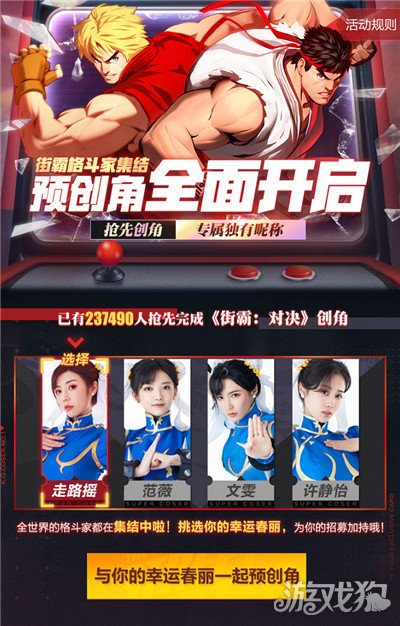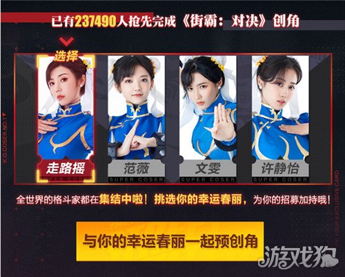 在活动的主界面,各位格斗家需要先从走路摇、范薇、文雯和许静怡(瑞丽签约艺人)四位风格不一的春丽女神中选择其中一名,并在专属真人春丽的引导下,进行抽卡步骤。