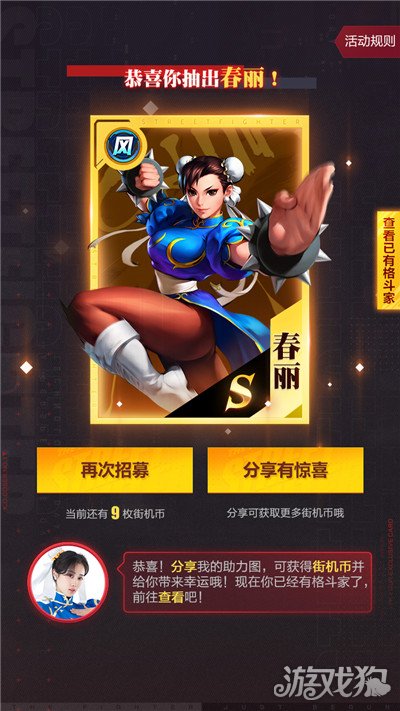 每位格斗家在活动的初始阶段,会有1次抽卡机会,参与每日分享可获得额外1次抽卡机会。