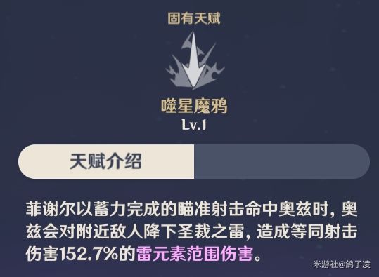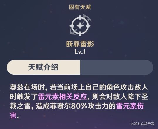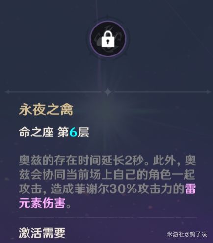 后台菲谢尔不适合与鸟同时驻场,在奥兹登场后,我们需要立刻切换角色,打出和雷相关的元素反应,此时不论是由菲谢尔造成的,还是别人造成的雷系反应,都会额外提供菲谢尔的天赋雷伤,内置CD极短,能够提供可观的伤害。