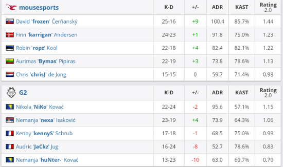 双方换边后Mouz渐有起色,比分被追到11平,之后G2调整战术打爆弹一波,Mouz防守火力不足G2拿到赛点。赛点局,kennyS慢摸狙掉在三箱独守B点的frozen,Mouz回防失败12-16输掉图一。