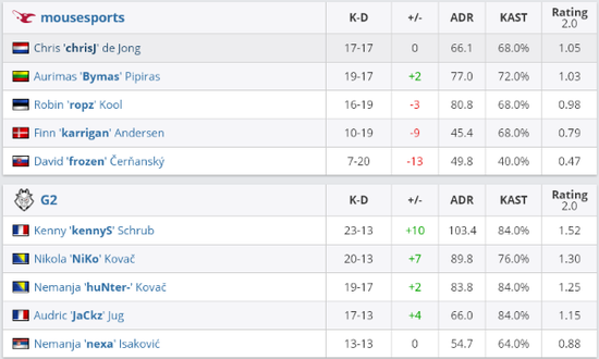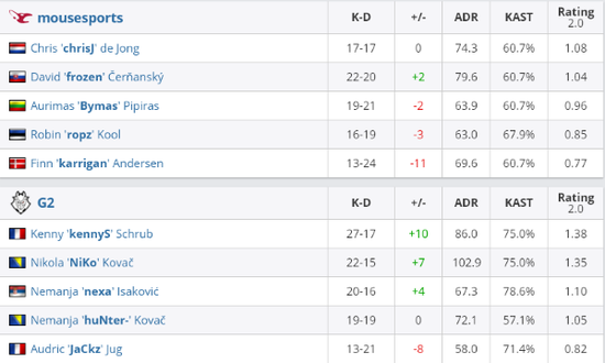 两队战至决胜图Nuke,CT方G2状态回暖,面对G2的铜墙铁壁Mouz一筹莫展,落后至2-8无奈叫出暂停调整。不过暂停仍然不能改变Mouz此时失误频出的队内状态,而且kennyS、NiKo不断大胆前压偷人,场上局势完全倾向于G2,上半场G211-4遥遥领先。下半场中纵使Mouz努力追分,但如此大的比分差距让其无力回天,最终G2 16-9淘汰Mouz。