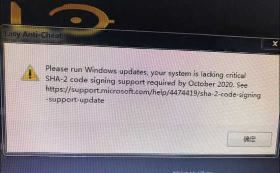 这个错误是Windows10系统版本过低,缺少SHA-2代码签名所导致的,玩家需要更新到2020年10月之后推出的Win10版本就可以正常游玩了。