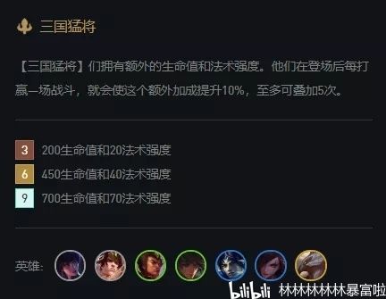 9三国猛将羁绊能提升大量的生命值和法术强度属性,每人增加700点生命值让阵容的坦度很高,70%的法术强度大幅度提升技能的伤害。皇子一到三星的技能伤害是175/250/750点魔法伤害,三星技能伤害有了质的提升,再加上羁绊中70%法强增幅之后,可以轻松秒掉沿途的一片敌人。沙皇还与皇子组成了2神盾使羁绊,这也是三国猛将英雄之间的唯一互动,神盾使羁绊给自己和附加的队友添加护盾。