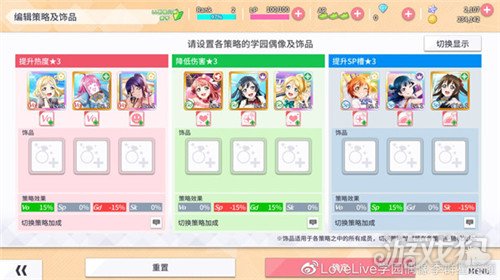 在策略编队界面中,玩家可以自己搭配拥有的学园偶像来设计、改变自己的策略,不同类型的学园偶像产生的策略效果和策略加成各不相同。玩家如何编队和灵活地切换策略将是攻略演唱会的关键之一。