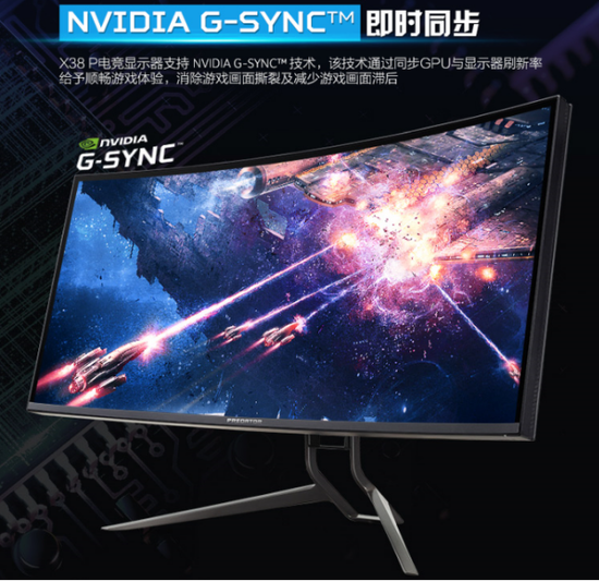 Predator X38采用37.5英寸的曲面带鱼IPS大屏,沿袭掠夺者系列凌厉酷炫的外观,同时保持着强悍的性能内核。搭载NVIDIAⓇ G-SYNCⓇ处理模块,不仅能带来流畅、无撕裂的游戏体验,而且还能凭借HDR400、3840*1600的分辨率、98%的DCI-P3的色域和Delta<2的超低色差,提供栩栩如生的逼真感,发挥IPS面板在色彩上的最大优势。配合高至175Hz的刷新率和低至1ms的响应速度将改变玩家对游戏体验的原有认知。