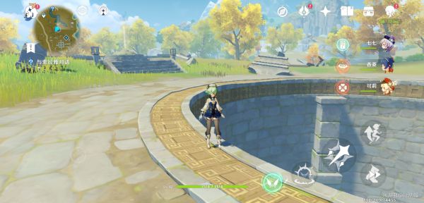 最后,全部激活完后,水池周围的遗迹守卫就会复活了,作为一个不怎么养角色的休闲玩家,我的原则是能不动手就不动手,大家都知道,除了史莱姆,所有的怪都是不会游泳的,嘿嘿,那就好办了,先让几个遗迹守卫走在一起,按照下图位置,沿着水池边边_遛 ! 遗迹守卫,别拉太远,因为水池的圆形弧度,慢慢拉着走,它们会一只脚踏空,然后掉下去…