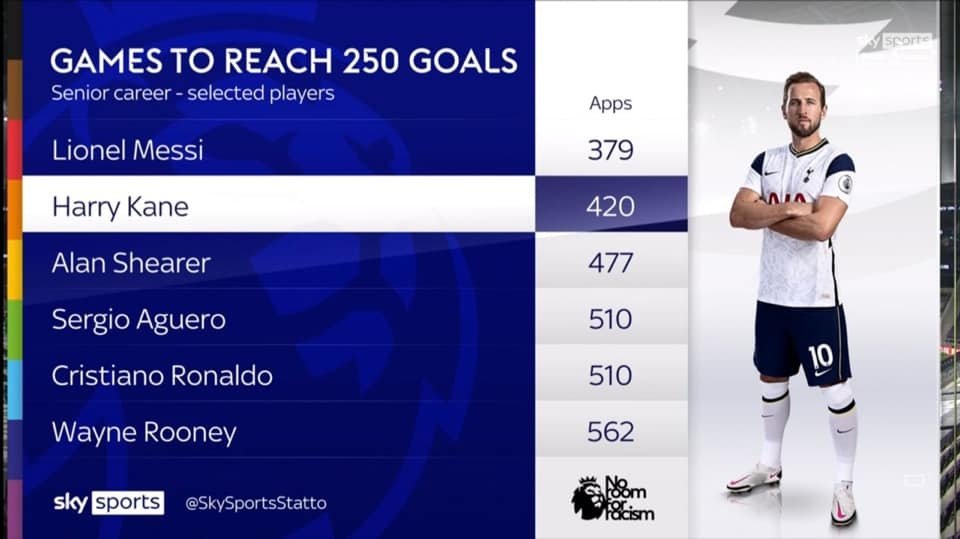 值得一提的是,这也是凯恩个人职业生涯的第250球,他收获250球用时420场比赛,这一效率仅次于梅西: