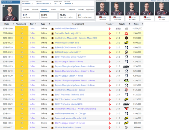 赛后还有热心粉丝指出,dev1ce至今已为Astralis征战了1000张地图之多。而在这么多量级的加持下,他的平均Rating依旧达到了1.17之多,69%的地图胜率、77%的地图评分1+、共赢得了21场赛事的冠军(包括4次Major,Intel大满贯,4次ECS,3次EPL,BLAST全球总决赛和ELEAGUE Premier)和11枚MVP奖牌(两次Major)。