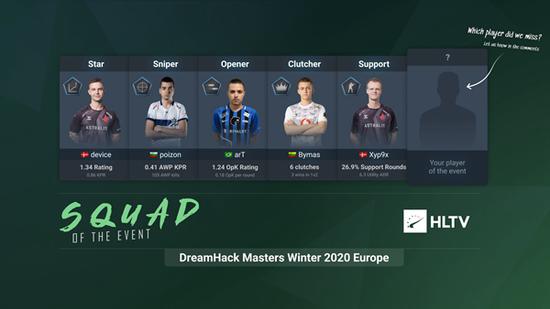 随着dev1ce在四张地图的持续爆发,Astralis战队最终以3-1的比分成功击败Mouz,夺得本次DH冬季大师赛欧洲区冠军。赛后,HLTV也是很快统计出了本次比赛的最佳阵容名单。