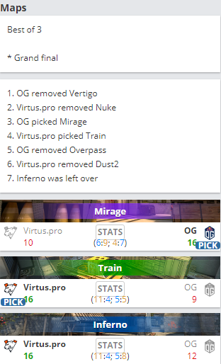 Virtus.pro 2-1 OG(Mirage 10-16;Train 16-9;Inferno 16-12)