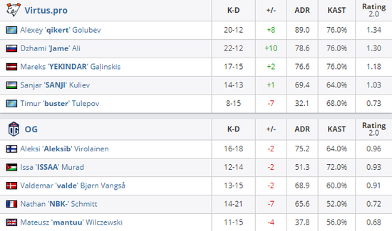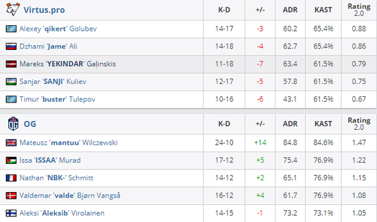 来到火车,情况发生逆转,在这张考验狙击枪的地图上Jame发挥出色,帮助队伍在进攻方一直拿分,OG这边也被打得难以施展手脚,对位的狙击手mantuu更是只有可怜的0.68的rating,半场结束OG已经4-11落后,最终在挣扎了几分之后也是无奈告负。大比分被VP追至1-1平。