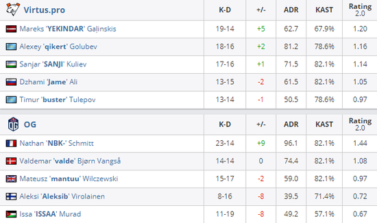进入决胜图Inferno,VP保持了自己火热的手感,全队也十分默契,在进攻方前期和对手纠缠来回之后,VP发现了对手的弱点,针对A区VP连续拿到分数,YEKINDAR好qikert带领队伍多次击溃对手。OG这边,Aleksib和ISSAA被针对得手感尽失,只有NBK一直在苦苦支撑。最终在Jame出色的进攻狙下OG还是12-16输掉了比赛。