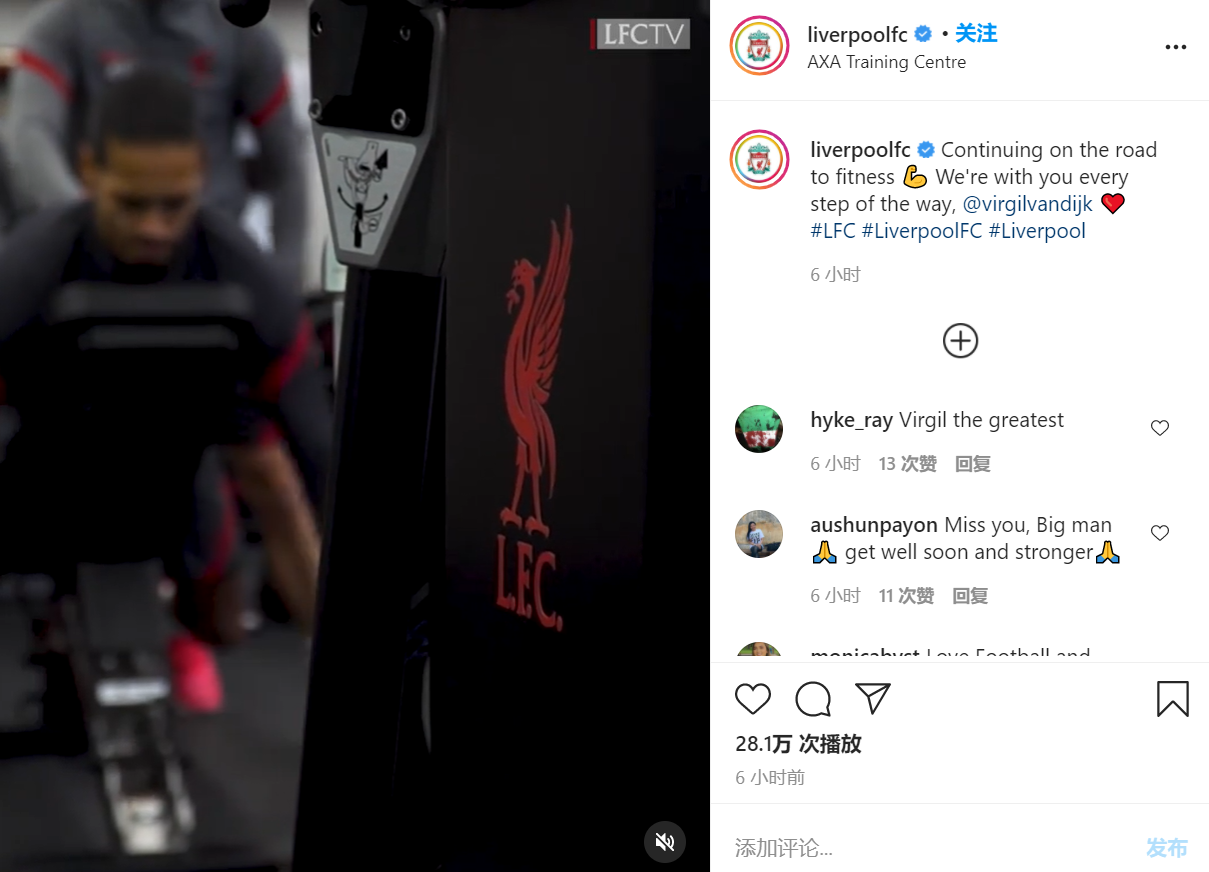 有利物浦球迷这样写道:“我估计范戴克会比蒂亚戈还早回归!”、“59秒的关于范戴克视频,让我充满着希望”、“哇这温暖了我的心”。