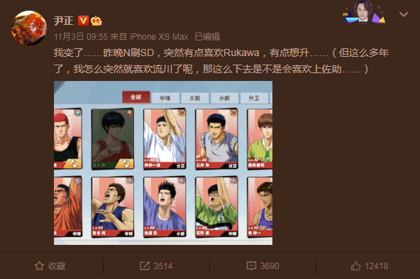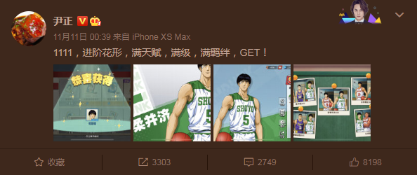 除了邓伦,另外一位影视红星尹正也是灌篮手游的忠实粉丝。上几周,集训花形透上线,尹老板当天就天赋拉满,让粉丝们一睹大佬的风采。围观尹正微博,可以发现他是彻彻底底的灌篮高玩,不仅版本进度追得勤快,还经常分享自己在游戏里的趣事以及难题,让许多粉丝有机会见到了他生活中的一面。球场见,果然是每个男生都会发出的邀约。