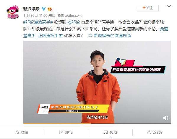 比如前文中提到的邓伦就多次和灌篮手游互动,早在游戏公测起他就一直为游戏发声。从公测宣传片的拍摄到微博多次安利,这位从小看着灌篮动画长大的当红明星在游戏中找到了关于篮球的梦想。