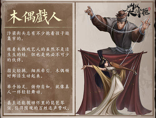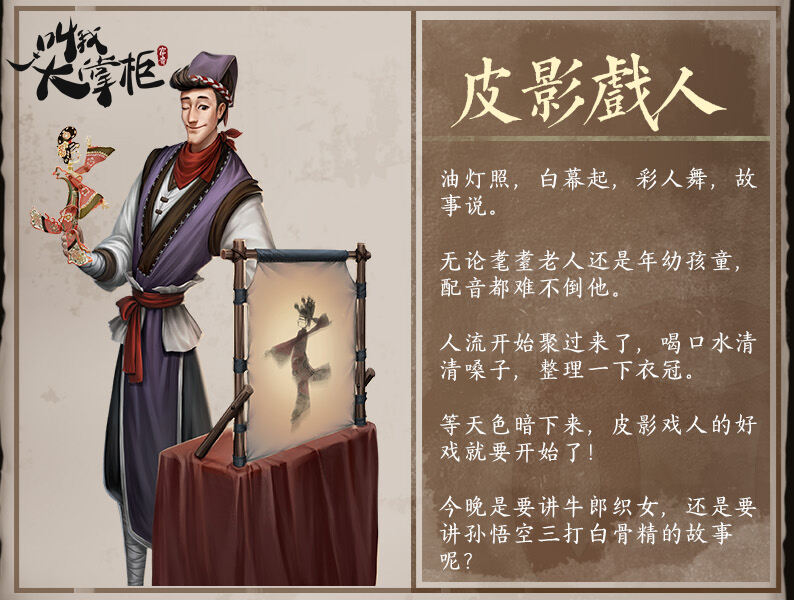 汴梁城北,李小棠。祖传皮影戏法,其祖上乃汉武帝大臣李少翁,因其武帝爱妃染疾故去,思念心切神情恍惚,终日不理朝政。其祖李少翁甚忧,某一日路遇孩童手拿布娃娃玩耍,影子倒映于地栩栩如生。心中一动,用棉帛裁成李夫人影像,涂上色彩,并在手脚处装上木杆。入夜围方帷,张灯烛,恭请皇帝端坐帐中观看。武帝看罢龙颜大悦,就此爱不释手。自此其艺传于世。到李小棠已传至第十二代,如今在汴梁城勾栏谋生,其皮影技艺已胜过先辈,深受汴梁富商百姓喜爱。君若不信,不如前往一观!