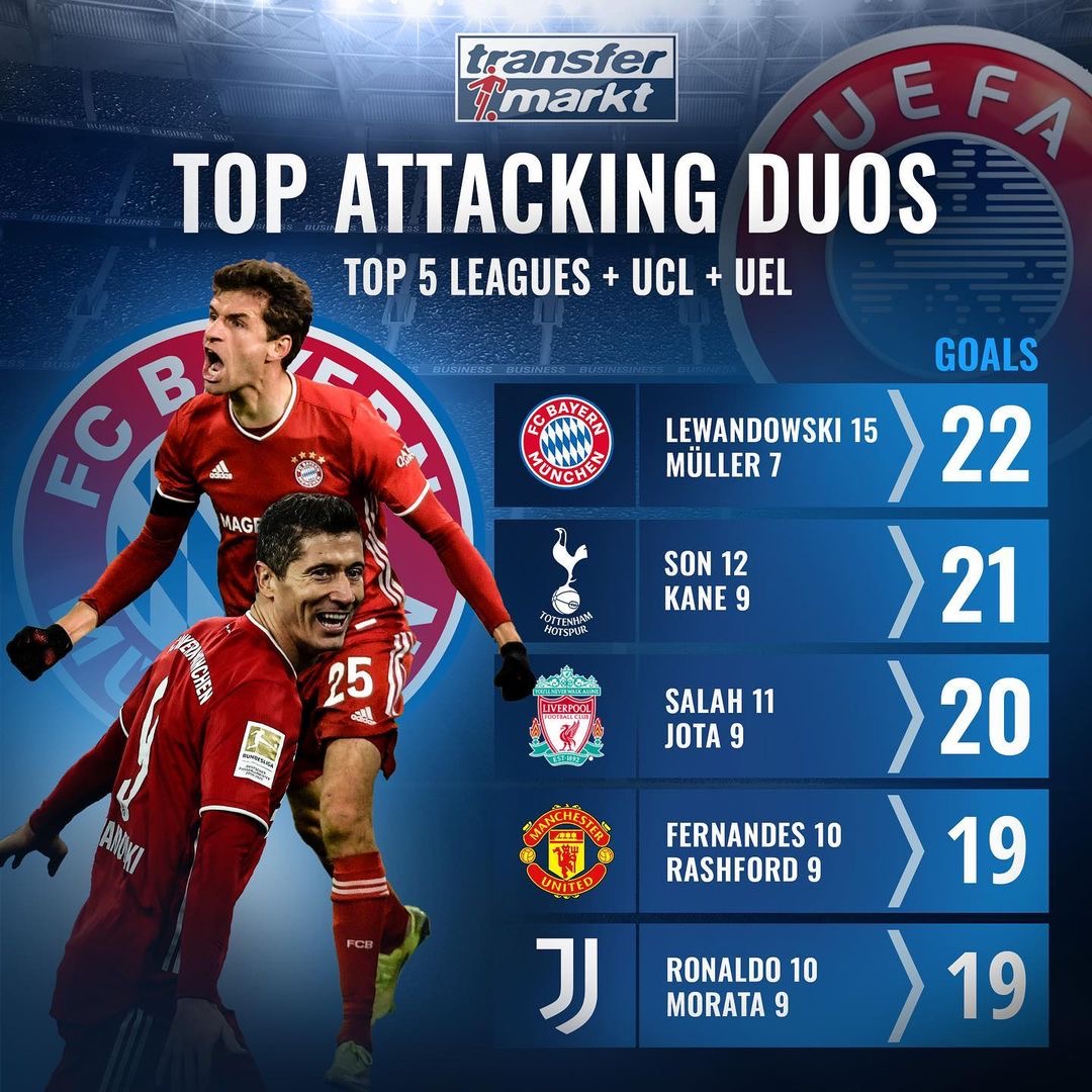 虎扑12月08日讯 德国媒体转会市场列出了本赛季欧洲攻击力最强双人组排名,在五大联赛以及欧战赛场上,欧洲攻击力最强的双人组合是拜仁球星穆勒和莱万。莱万本赛季进了15球,穆勒进了7球,两人合计进了22球。排在莱万穆勒之后的是热刺双人组凯恩和孙兴慜,凯恩和孙兴慜两人共进了21球。