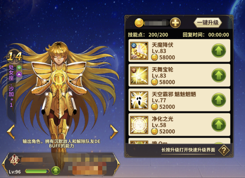 以人气颇高的黄金圣斗士沙加为例,其必杀技为天魔降伏,而觉醒技则是随机剥夺对手五感的天舞宝轮。至于咱们熟悉的青铜五小强则可以在登录游戏后直接获取,“天马流星拳”、“庐山升龙霸”、“星云锁链”等等经典招式自然都是缺一不可的。
