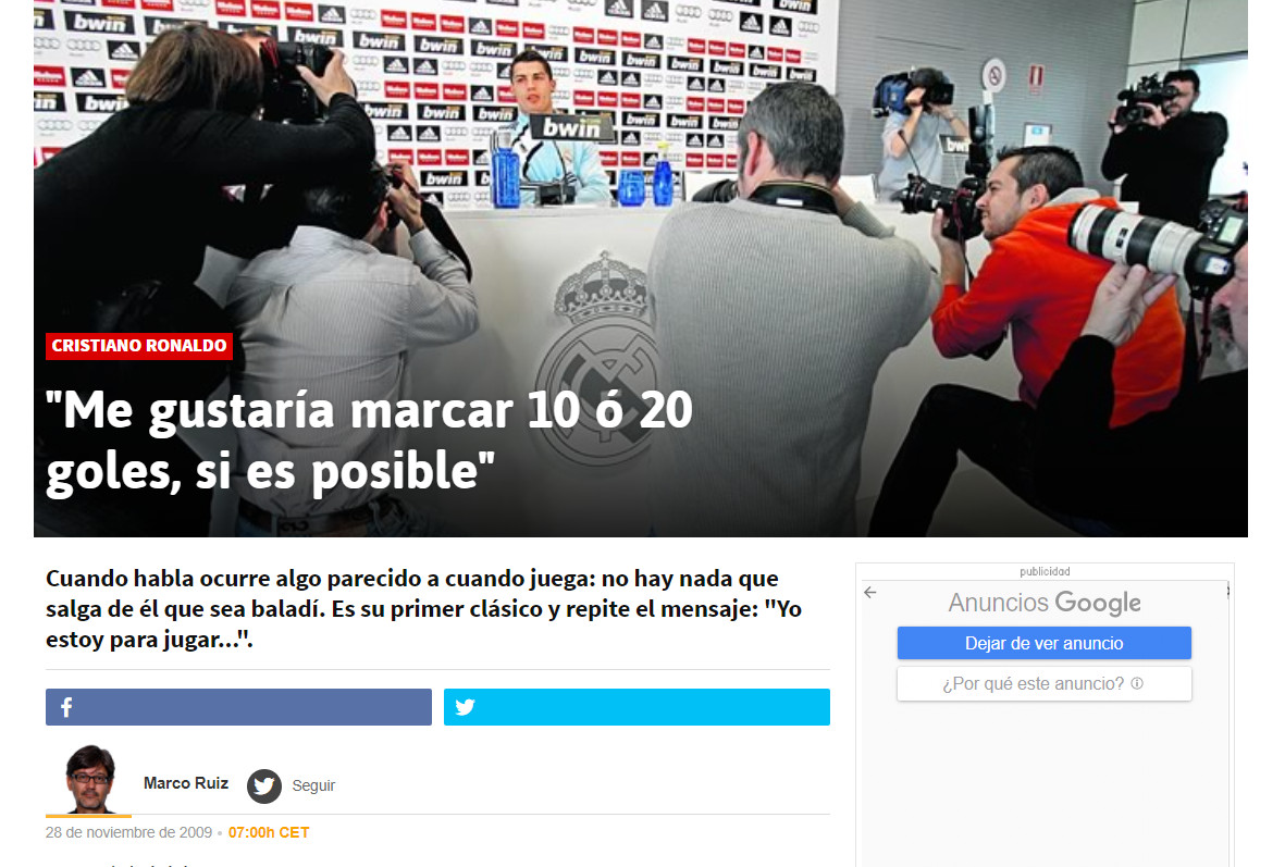 2009年11月29日,C罗第一次参加西班牙国家德比,而他也特别被安排参加了赛前的新闻发布会。期间被问到明天希望对巴萨进多少个球,初来乍到的C罗笑着说道:“我想对巴萨进10个,20个球,不过我不知道有没有可能。“