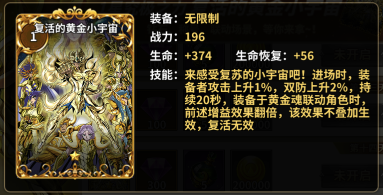 在活动期间累计登录14天,就可以轻松收获包括2200钻石在内的丰厚奖励,登录满十四天后更能获得一星金色究极之力“复活的黄金小宇宙”。将该究竟装备于黄金魂联动角色身上时,可以获得增益效果翻倍的特殊联动,具体属性如下图所示: