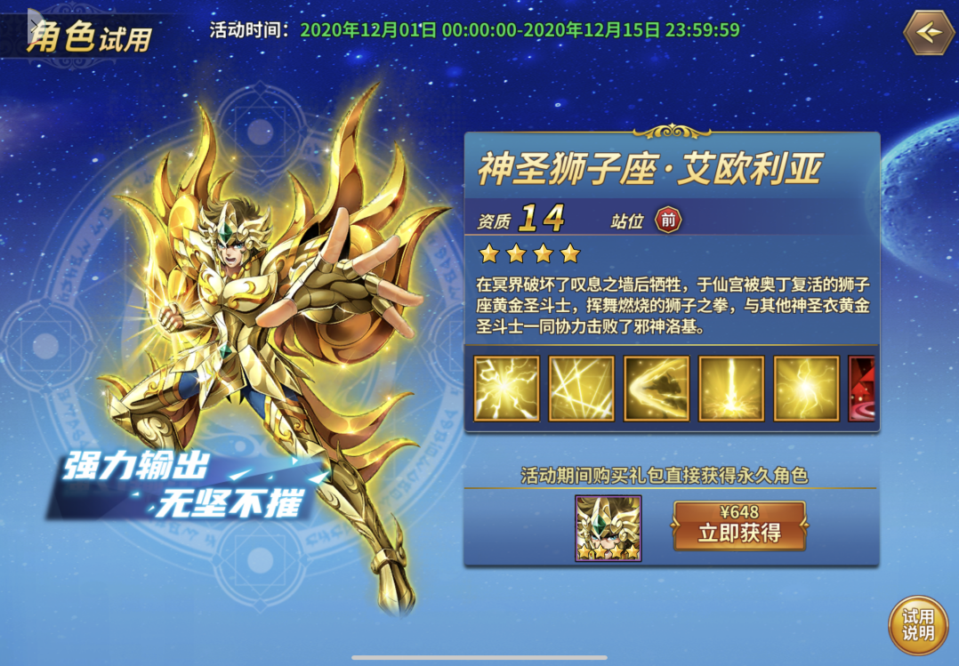 而目前大家可以入手的新角色则是联动作品的主角——神圣衣版的狮子座艾欧利亚。入手方式分为直接礼包购买和转盘抽取两种,至于要选哪种就由大家根据自身情况决定。