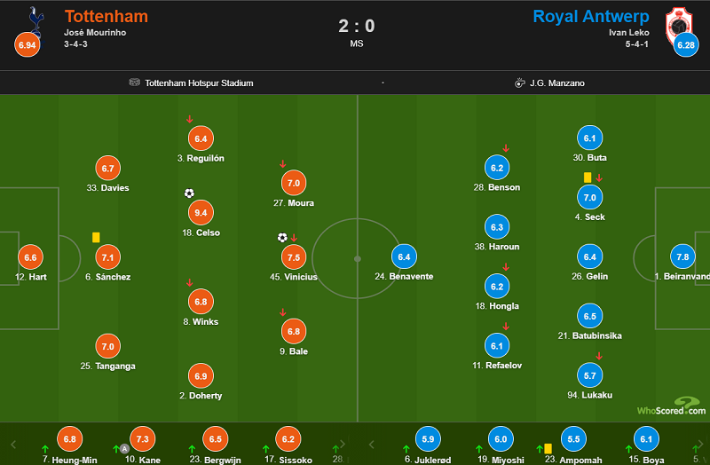 热刺(3-4-3):12-哈特、2-多尔蒂、3-雷吉隆(46‘贝尔温)、6-D-桑切斯、25-坦根加、33-本-戴维斯、8-温克斯(59‘恩东贝莱)、18-洛切尔索、9-贝尔(58‘孙兴慜)、27-小卢卡斯(68’穆萨-西索科)、45-卡洛斯-维尼修斯(59’凯恩)