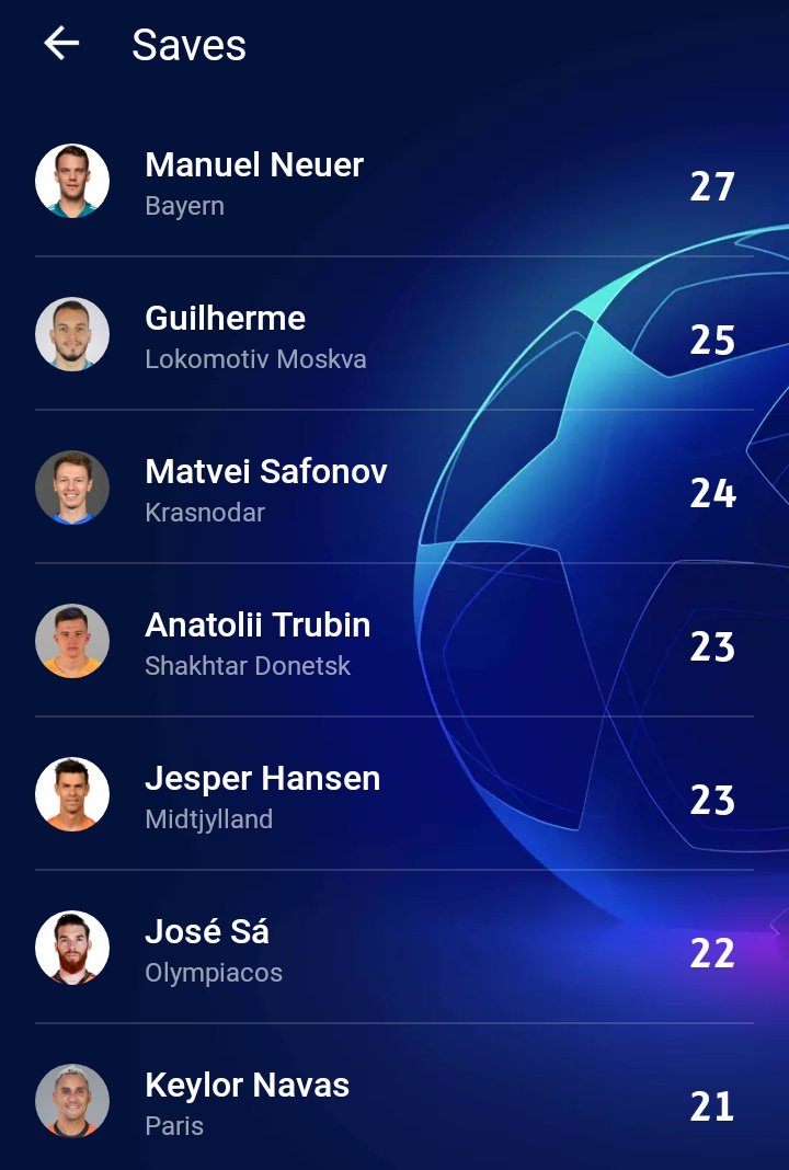 诺伊尔在小组赛阶段参加的5场比赛中,贡献了27次扑救,是整个小组赛阶段扑救次数最多的门将。