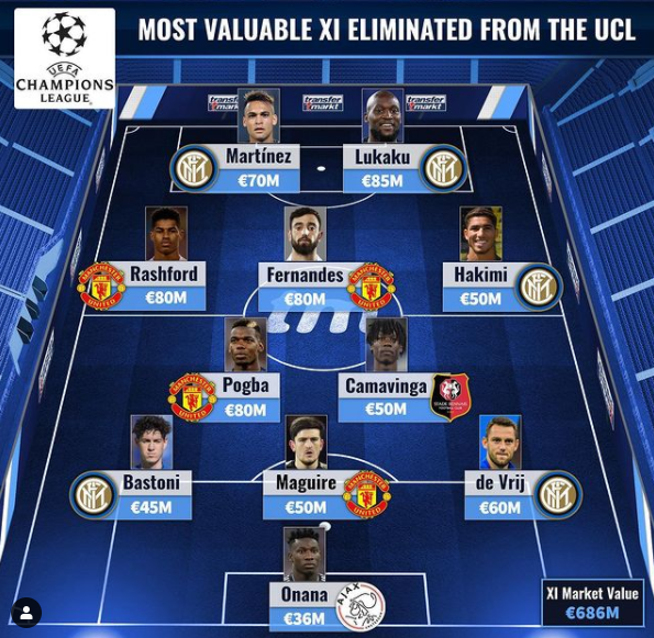 虎扑12月11日讯 随着欧冠小组赛阶段的结束,德国转会市场也统计出了小组赛出局最贵阵容,曼联和国米作为出局的两大豪门,分别有四人和五人进入阵容。