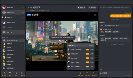 在新版虎牙直播PC客户端中,用户点击虎牙语音,进入页面,即可通过创建云游戏房在虎牙直播内畅玩YOWA平台上的云游戏。在云游戏房间中,观众点击“我来玩”即可向房主申请游戏控制权,经房主授权即可接替房主操作游戏。在多人竞技类游戏中,点击“一起玩”,观众还可以申请与房主在游戏中进行对战。