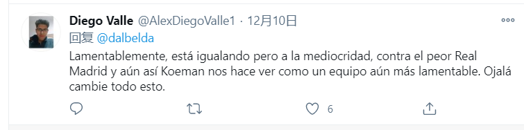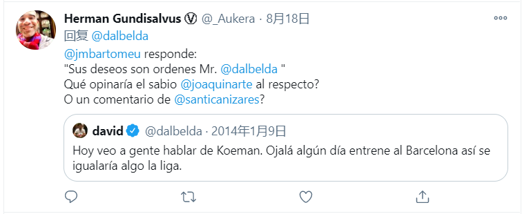 虎扑12月12日讯 最近巴萨的糟糕战绩引起各方的讨论,而一条7年前的推特被西班牙球迷们再次提起。这条推特的主人是前瓦伦西亚队长阿尔贝尔达,他在2014年1月的时候曾经写道: