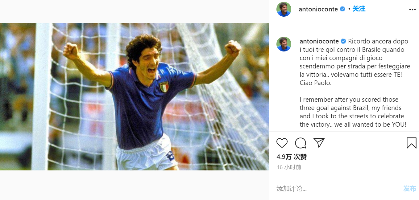 孔蒂在Ins上这样写道:“我还记得,当年你(罗西)在对阵巴西的比赛中上演了帽子戏法后,我和我的朋友们都走上街头,庆祝比赛的胜利。我们都想成为你!”