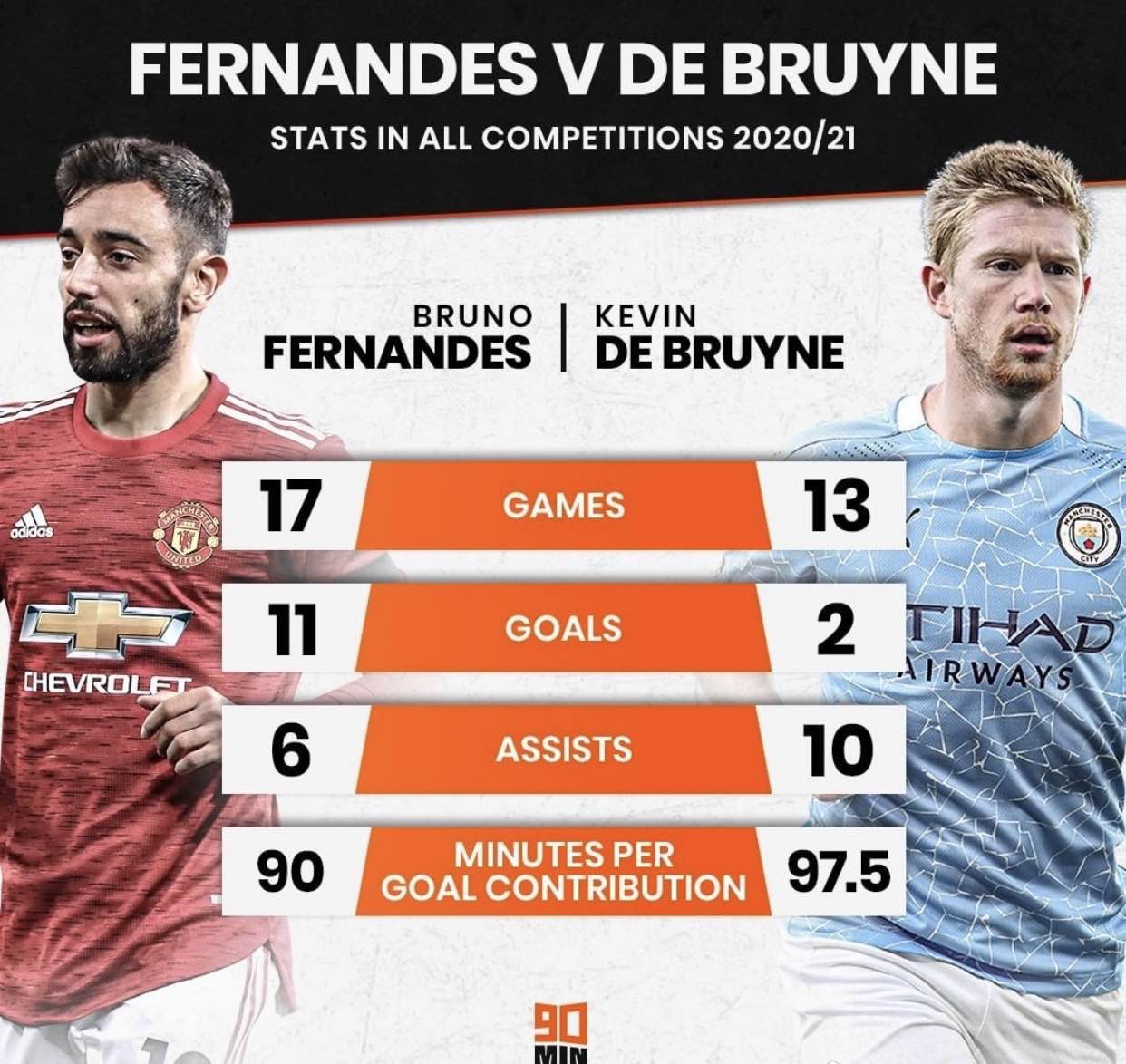 据数据统计,本赛季B费代表曼联各项赛事出场17次,取得了11粒进球6次助攻,每90分钟贡献1球;德布劳内代表曼城各项赛事出场13次,取得2粒进球10次助攻,平均参与1球也仅要97.5分钟。
