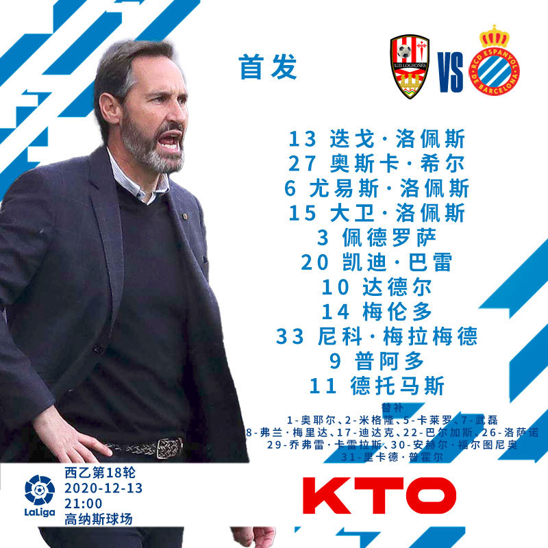 虎扑12月13日讯 西乙联赛,西班牙人客战洛格罗涅斯,赛前双方公布了首发阵容,中国球员武磊替补待命。