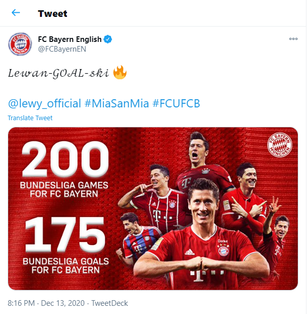虽然本场比赛拜仁未能取得比赛胜利,但莱万迎来了代表拜仁出战200场德甲的里程碑。拜仁官方推特中的海报指出,在这200场德甲比赛中,莱万共为拜仁慕尼黑打进入175球。拜仁配文称赞莱万多夫斯基是“莱万-进球-斯基”。