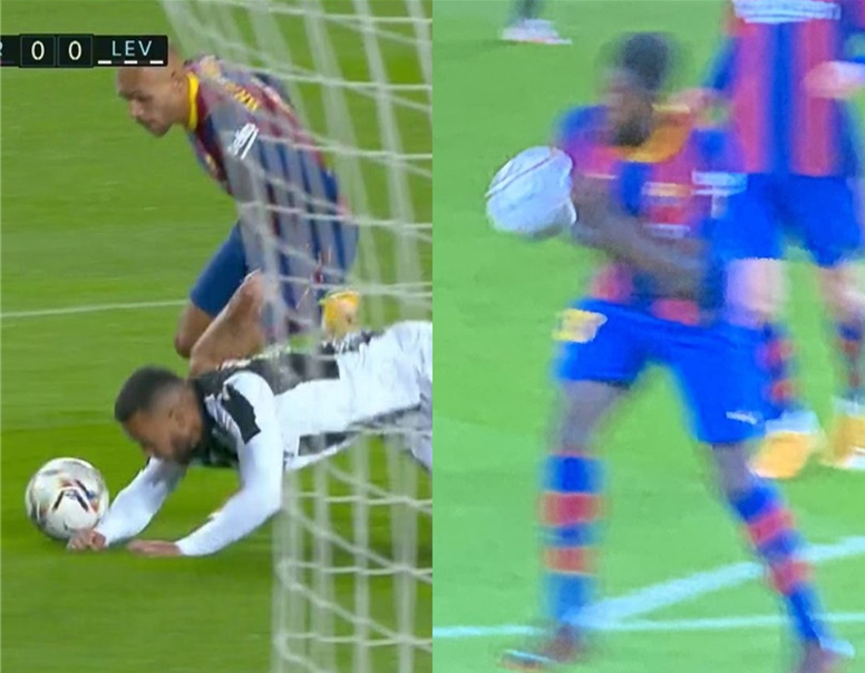 另一次则是比赛补时阶段,莱万特队长莫拉莱斯禁区内抽射,直接打到了乌姆蒂蒂身上,莱万特方面抗议乌姆蒂蒂手球,对此裁判同样没有进行判罚。