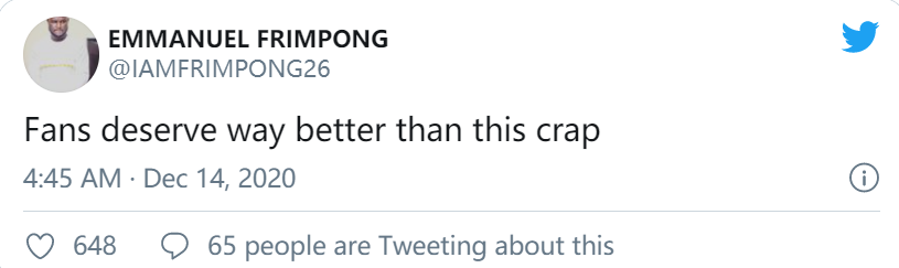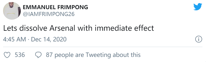 此外,在看了本场比赛阿森纳的糟糕表现后,弗林蓬在推特上还这样写道:“让我们立即解散这支阿森纳吧”