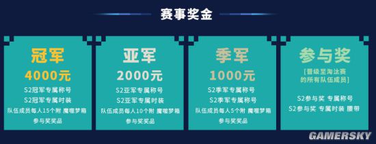 获得冠军的参赛队伍将获得4000元现金奖励,以及S2冠军专属称号、S2冠军专属时装、队伍成员每人15个小时魔噬梦箱等精美虚拟奖励。