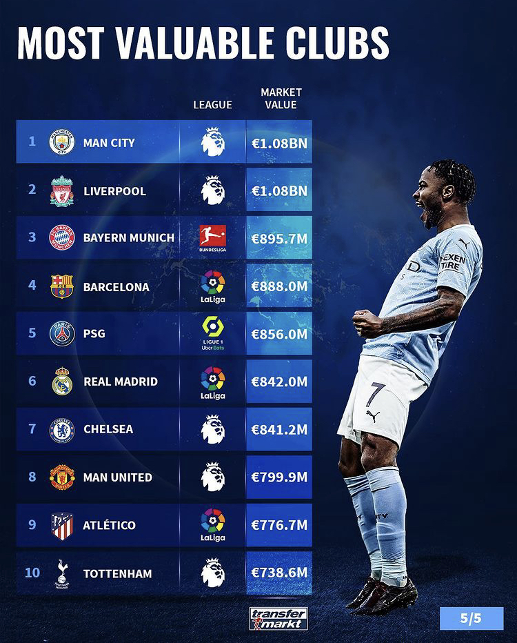虎扑12月15日讯 德转市场公布了最新一期的球队身价排行榜,相较于此前的榜单,排名第二的曼城以10.8亿欧元的身价追平了利物浦,而拜仁则是反超了巴萨,跃居第三位。