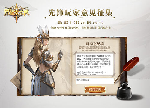天使大陆演绎着众多勇者的精彩故事,充满独特魅力的世界,离不开每位勇者的支持与热爱。活动期间(12月17日~12月23日)说出你对《荣耀大天使》的期待与建议,我们将虚心接纳,并为后续创造出更好的优质内容而奋发努力。同时,凡是被接纳的反馈与优质建议,不仅能在游戏中得到实现,更有百元京东卡作为答谢礼双手奉上。
